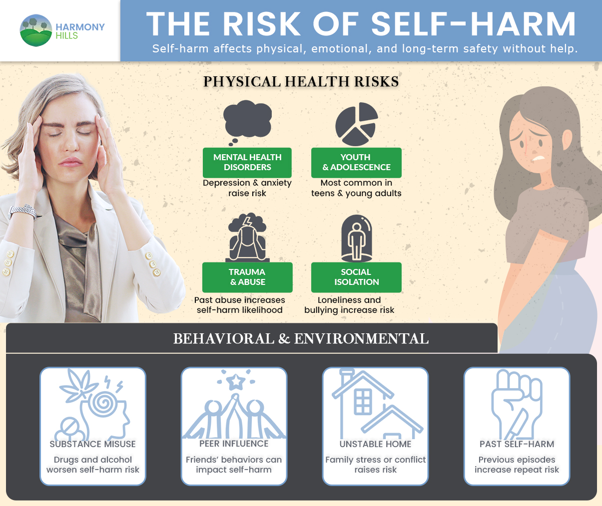 With the help of a self-injurious treatment center like Harmony Hills, you can avoid these risks and get on the path to recovery.